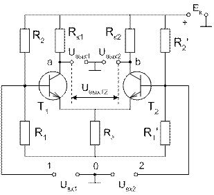 изменяться напряжение E. На рис.2.22 представлена схема простейшего дифференциального каскада, которая аналогична схеме рис. 2.21, если резисторы R2 и R3 заменить транзисторами T1 и T2 и считать, что R1=Rk1, а R4=Rk2. Сопротивления резисторов Rk1 и Rk2 выбирают равными, а транзисторы T1 и T2 с идентичными характеристиками. В этом случае схема симметрична.