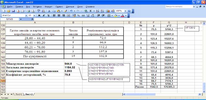 Рис. 17. Розрахунок емпіричного кореляційного відношення та коефіцієнта детермінації. Отже за результатами розрахунків можна зробити висновок про те, що між реалізованою продукцією (Y ) та вартістю основних виробничих фондів(X) існує сильний (тісний) взаємозв'язок ( Завдання 3 п. 2 передбачає для оцінювання тісноти взаємозв'язку між вартістю основних виробничих засобів і реалізованою продукцією розрахунок коефіцієнта Фехнера і коефіцієнта кореляції рангів Спірмена за формулами:
