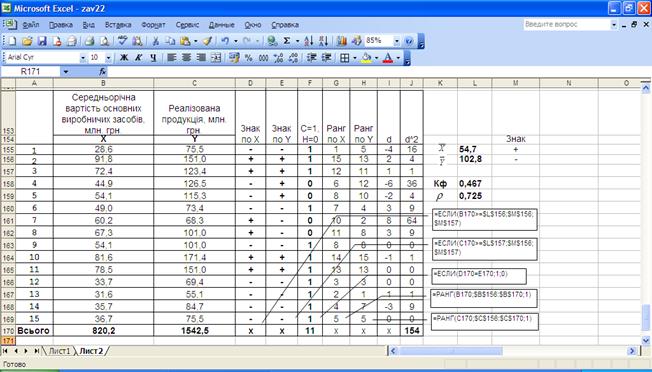 де С, Н – відповідно кількість співпадань і неспівпадань знаків відхилень від середньої; d – різниця рангів по X та Y. Для розрахунку зазначених коефіцієнтів доцільно використовувати робочу таблицю, у якій навести знаки відхилень від середньої для кожної одиниці сукупності, а також ранги значень X та Y, а далі у відповідних комірках задати відповідні формули для обчислення (рис. 18).