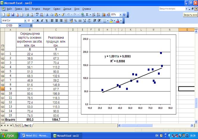Рис. 21. Результати виконання розрахунків за допомогою інструменту аналізу «Регрессия» Покажемо взаємозв'язок між Х та Y у вигляді лінійного графіка, для цього використаємо «Мастер диаграмм» – Тип – Точечная (рис. 22).