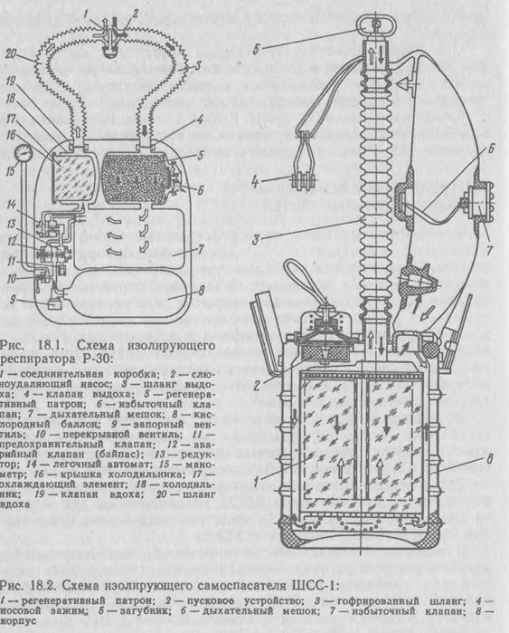 Выдыхаемый воздух через загубник (или дыхательную маску), соединительную коробку, выдыхательный шланг и клапан выдоха поступает в регенеративный патрон, в котором он очищается от углекислого газа, а затем в дыхательный мешок, где обогащается кислородом. При вдохе воздух, обогащенный непрерывно поступающим из баллона кислородом, через клапан вдоха, шланг вдоха, соединительную коробку и загубник попадает в легкие человека. Таким образом, движение воздуха осуществляется по замкнутому кругу и всегда в одном и том же направлении. Регенеративный патрон заполнен известковым химическим поглотителем ХПИ. Обогащение воздуха кислородом ведется постоянно, периодически и разово (аварийно). Постоянная и периодическая подача кислорода осуществляется автоматически, аварийная — нажатием на аварийный клапан (байпас). Изолирующий самоспасатель ШСС-1 (рис. 18.2) также имеет регенеративный патрон, который заполнен гранулированным кислородсодержащим продуктом. Пусковое устройство при вскрытии самоспасателя срабатывает автоматически и выделяет за 20—30 с около 5 л кислорода. Дальнейшее поступление нужного для дыхания кислорода обеспечивается регенеративным патроном за счет реакции выдыхаемого углекислого газа и влаги с кислородсодержащим продуктом, при которой происходит очистка воздуха от углекислого газа и выделение чистого кислорода. Масса самоспасателя 2, 95 кг. Передвижные спасательные пункты ПСП и ПСПМ устанавливаются в горных выработках на пути следования шахтеров при выходе из аварийного участка и у места их работы. Они предназначены для переключения шахтеров из самоспасателей с истекшим временем защитного действия в новые на длинных маршрутах выхода, включения шахтеров в самоспасатели при отсутствии индивидуального закрепленного самоспасателя на рабочем месте в момент возникновения аварии, обеспечения шахтеров пригодным для дыхания воздухом в зоне размещения пункта до момента восстановления нормальной вентиляции. Пункт ПСП работает автономно. Воздухораспределительная система состоит из 40-литрового баллона со сжатым воздухом, редуктора, четырех легочных автоматов, к которым подсоединены четыре гофрированных шланга воздуховодов с полумасками и загубниками. Подача воздуха к воздуховодам осуществляется автоматически при открывании двери пункта. На левый боковой стенке ПСП крепится шахтный телефон. В пункте ПСПМ питание сжатым воздухом воздуховодов с полумасками осуществляется от шахтной пневмосети. Поэтому их время защитного действия практически неограниченно. Переносной спасательный аппарат ПСА предназначен для обеспечения дыхания шахтеров сжатым воздухом, когда при аварии целесообразно переждать некоторое время до восстановления нормальной вентиляции. Аппарат устанавливается в уступах потолкоуступных лав или в подготовительных забоях и рассчитан на два человека. Питание сжатым воздухом осуществляется от шахтной пневмосети.