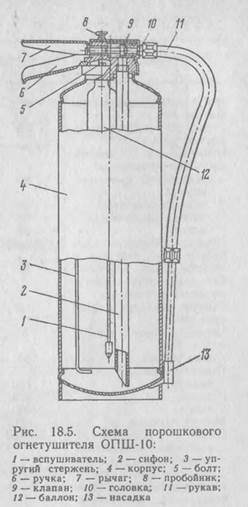 Аппаратура «Кварц» состоит из блока приемо-передатчика. смонтированного в пылебрызгозащищенном корпусе, и рамочной антенны. Блок приемопередатчика и антенна соединены друг с другом шнуром в полихлоридной оболочке. Рамочная антенна имеет жесткую конструкцию, выполненную в форме полуцилиндра. На ручке антенны имеется кнопка перехода с приема на передачу, дублирующая кнопку на корпусе аппарата. Ручные огнетушители являются наиболее распространенным средством тушения подземных и поверхностных пожаров в начальной стадии их возникновения. Они бывают пенные и порошковые. Принцип действия химических пенных огнетушителей основан на взаимодействии щелочной и кислотной частей заряда, в результате которого выделяется углекислый газ, вспенивающий пенообразующий раствор в корпусе огнетушителя. Образующаяся пена под давлением выбрасывается через специальный спрыск. Порошковые огнетушители обладают более высокими огнегасительными свойствами, чем пенные, и имеют более широкую область применения. Они предназначены для тушения воспламенившихся деревянной крепи, угля, конвейерной ленты, масел, метана и электрооборудования, находящегося под напряжением, в начальных стадиях пожара. В горноспасательных частях широко применяются порошковые огнетушители ОПШ-10 со следующей технической характеристикой: