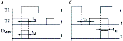 В результате такой работы схемы, шумы входного сигнала не будут влиять на выходной сигнал. · Формирование импульсов Формирователь коротких импульсов с применением линий задержки. Формирователь коротких импульсов формирует импульсы, длительность которых существенно меньше длительности исходных импульсов. Для построения схемы формирователя потребуются один элемент конъюнкции, один инвертор и линия задержки. Длительность выходного импульса формирователя определяется длительностью времени задержки линии задержки Dtз и средним временем распространения сигнала через инвертор tз срЭ1. На рис. 4.1 приведена схема формирователя, а на рис. 4.2, а, б – временные диаграммы, иллюстрирующие её работу. Из рис. 4.2, а следует, что для формирования импульса от переднего фронта (исходный импульс) необходимо подавать на линию задержки инвертированный импульс.