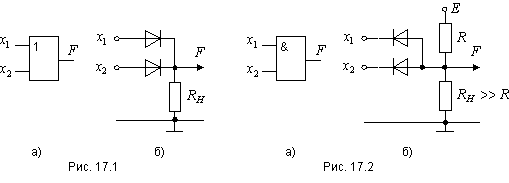 Логические схемы, реализующие операцию ИЛИ; называют ячейками ИЛИ. Их схемное обозначение приведено на рис. 17.1а. Простейшая реализация логической ячейки ИЛИ на диодах приведена на рис. 17.1б. Напряжение на выходе схемы будет равно E (F=1), если хотя бы на один из входов будет подан единичный сигнал. Выбор типа выпрямителя.Так как однофазный мостовой двухполупериодный выпрямитель обладает рядом преимуществ по сравнению с другими схемами выпрямления, то его целесообразно выбрать в качестве схемы выпрямления. Логическое умножение (конъюнкция или операция И) записывается в виде