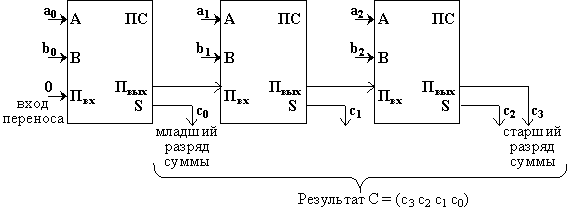 Если требуется складывать двоичные слова длиной два и более бит, то можно использовать последовательное соединение таких сумматоров, причём для двух соседних сумматоров выход переноса одного сумматора является входом для другого. Например, схема вычисления суммы C = (с3 c2 c1 c0) двух двоичных трехразрядных чисел A = (a2 a1 a0) и B = (b2 b1 b0) может иметь вид: