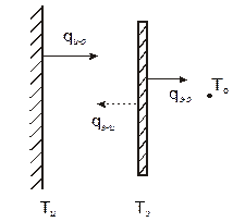Обозначения на рисунке: qи-о – интенсивность тепло-вых излучений от источника к объекту облучения (без экрана), Вт/м2; qэ-и – отраженный тепловой поток от экрана к источнику излучения, Вт/м2; qэ-о – тепловой поток от экрана к объекту обучения, Вт/м2; Tи – температура источника излучения, К; Tэ – температура экрана, К; Tо – температура объекта облучения, К. Поток излучения qи-о, встре-чая на пути экран с высокой теплоотражательной способ-ностью, отражается от него в основном обратно к источ-нику (qэ-и) и лишь некоторая доля его поглощается экра-ном. Нагреваясь в результа-те поглощения некоторого количества энергии до тем-пературы Tэ, экран в свою очередь излучает тепловой поток qэ-о. Однако это излу-чение в значительной степе-ни ослаблено. Если устано-вить ряд экранов, то излуче-ние можно значительно сни-зить. Тепловой поток qи-о до установки экрана можно определить по закону Сте-фана-Больцмана