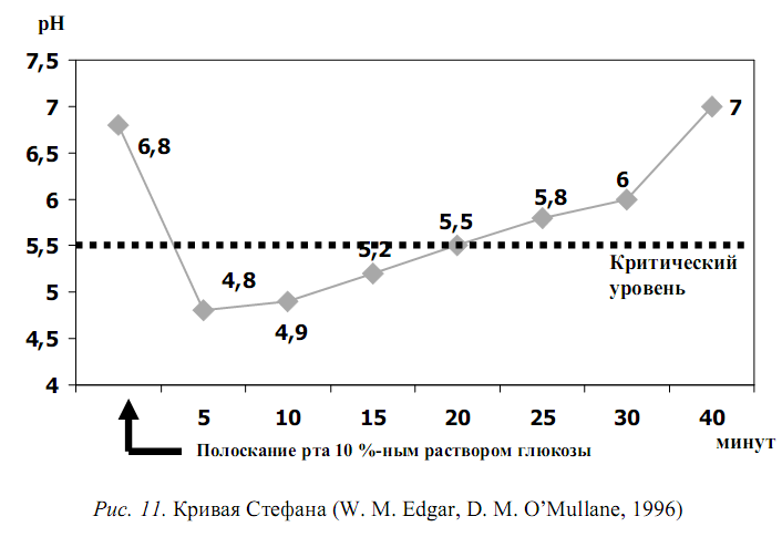 Все элементы регуляции гомеостаза КОС связаны между собой, но так как ротовая жидкость является главной средой полости рта, изменение ее рН является наиболее информативным показателем КОС в полости рта. Подтверждением этого является кривая рН Стефана. Под влиянием углеводов, микробная кислотопродукция в ротовой жидкости, зубном и язычном налете вызывает резкое снижение рН в течение нескольких минут и последующее медленное восстановление. Ротовая жидкость является основной средой полости рта. Поэтому рН ротовой жидкости представляется наиболее точным показателем кислотно-основного состояния полости рта, который определяют с помощью ацидотических и алкалотических кривых. Кривая Стефана (ацидотическая) (рис.1) характеризует образование кислот в ротовой жидкости, зубном и язычном налетах при поступлении в ротовую полость сахарозы, которая расщепляется под действием микробных гликолитических ферментов. Продукция кислот после приема углеводов является кариесогенным фактором. Образование кислот при расщеплении углеводов вызывает резкое снижение рН ротовой жидкости в течение нескольких минут и последующее медленное восстановление. Соответствующие расчетные показатели кривой дают четкую информацию о гомеостатических параметрах в полости рта. Амплитуда кривой Стефана характеризует кислотопродуцирующую активность ротовой микрофлоры и эффективность механизмов регуляции кислотно-основного состояния. Таким образом, чем больше амплитуда кривой, тем больше в ответ на стимуляцию углеводами микрофлорой вырабатывается органических кислот (преимущественно, молочной) и тем меньше буферная емкость, обеспечивающая устранение ацидоза.