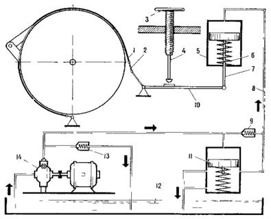 Затормаживание брашпиля (рис. 8) осуществляется через тягу 2 и рычаг 10 пружиной 6. Растормаживается ленточный тормоз при подаче масла в гидроцилиндр 5 насосом 14 либо вручную вращением маховика 3 с винтом 4. Подача масла к гидроцилиндру осуществляется при нажатии кнопки «Пуск» на пульте дистанционной отдачи якоря. При этом включается электроприводной лопастной насос 14 и масло под давлением 3, 5 МПа через обратный клапан 9 поступает в верхнюю полость гидроцилиндра 5. Одновременно золотник 11 смещается вниз, перекрывая сливной канал, сообщающий нагнетательную магистраль 8 с масляным баком 12. Давление в верхней полости гидроцилиндра возрастает и толкатель 7, сжимая пружину, поворачивает рычаг 10 по часовой стрелке и растормаживает ленточный тормоз 1. Травление якорной цепи продолжается до тех пор, пока нажата кнопка «Пуск», при этом избыток масла из нагнетательной магистрали сбрасывается в масляный бак через перепускной клапан 13. При отпускании кнопки «Пуск» насос останавливается. Давление в магистрали 8 падает, золотник 11 смещается вверх и открывает сливной канал, сообщающий верхнюю полость гидроцилиндра 5 с масляным баком 12. Толкатель под действием пружины поворачивает рычаг 10 против часовой стрелки и затягивает тормозную ленту 1. Отдача якоря прекращается.