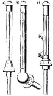 Температуру воды, топлива, масла, пара и газа измеряют термометрами. Принцип их действия основан на изменении свойств тел при изменении их температуры. В зависимости от физических свойств тел, используемых в термометрах, последние подразделяют на: - термометры расширения; - манометрические термометры сопротивления; - термоэлектрические термометры. Термометрами расширения измеряют температуру среды от 200 °С до 500°С, манометрическими от 130°С до 550°С, термометрами сопротивления от 200°С до 500°С, термоэлектрическими – от 200°С до 1600°С. Обычно приборы, измеряющие температуру в пределах до 500÷ 600°С, называют термометрами, а приборы, пределы измерения температуры которыми выше 600°С – пирометрами. Термометры расширения. Принцип их действия основан на различии температурных коэффициентов теплового расширения разных тел. Термометры расширения бывают жидкостные, биметаллические и дилатометрические. На судах речного флота применяют в основном жидкостные и биметаллические термометры расширения. Принцип работы жидкостных термометров основан на свойстве теплового расширения ртути, этилового спирта и других жидкостей, заключенных в стеклянную трубку. Для измерения температуры в судовых условиях в качестве жидкостных используют в основном ртутные термометры.