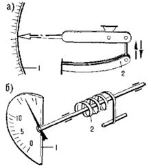 Температура кипения жидкости, как известно, повышается с ростом давления, поэтому для увеличения верхнего предела измерения температур пространство над ртутью в стеклянной трубке (капилляре) заполняют азотом под давлением до 2 МПа, Верхний конец трубки запаян, а нижний имеет форму расширяющегося резервуара. Ртутные жидкостные термометры выпускают прямыми и угловыми. В зависимости от предела измерения температуры они имеют номера от первого до одиннадцатого. Наибольший номер соответствует наибольшему пределу измерения. Металлические оправы стеклянных трубок бывают прямыми (рис 18, а) и угловыми (рис. 18, б). Для измерения температуры и сигнализации о достижении ею предельных значений применяют электроконтактные ртутные термометры (рис. 18, в). В пределах измеряемых температур до 100°С относительная погрешность результатов измерений ртутных термометров не превышает ±2÷ 4%. Ртутные термометры сравнительно дешевы, просты по устройству, их легко монтировать на объектах измерения. Недостатки таких термометров – небольшая механическая прочность, некоторое неудобство отсчетов по шкале и низкая чувствительность при быстрых изменениях температуры. Биметаллические термометры (рис. 19) представляют собой пружину, составленную из двух спаянных между собой металлов, например инвара (сплава железа с никелем) и латуни, с разными температурными коэффициентами теплового расширения.