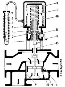 Регулятор температуры прямого действия дистанционный (РТПД). Регуляторы РТПД (рис. 31) состоят из термобаллона 7, соединенного капиллярной трубкой 6 с сильфонным исполнительным элементом, и регулирующего органа в виде золотника 15, смонтированного в трехходовом корпусе 14.