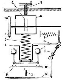 Вал 13 всережимного регулятора дизелей 6ЧСП18/22 приходит во вращение от привода через коническую шестерню. На поперечине 14 регулятора шарнирно закреплены два груза 9 в виде угловых рычагов. При вращении вала 13 регулятора грузы воздействуют на муфту и стакан 1.