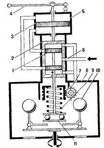 При установившемся режиме работы дизеля центробежные силы вращающихся грузов 10 уравновешиваются силой натяжения пружины 9, и золотник 1 перекрывает отверстия во втулке 2, по которым масло из трубопровода 6 может поступать в верхнюю или нижнюю полость гидроцилиндра. Трубопровод 6 подключен к смазочной системе дизеля и с помощью редукционного клапана в нем поддерживается давление 0, 5÷ 0, 7 МПа. С изменением нагрузки на дизель, например, с ее уменьшением, грузы центробежного измерительного преобразователя угловой скорости расходятся и муфта 11, поднимаясь, перемещает золотник вверх. Масло через трубопровод 6 поступает в нижнюю полость гидроцилиндра, а из верхней полости сливается в корпус 8 из мерительного элемента регулятора и далее в картер дизеля. При возрастаний давления в нижней полости гидроцилиндра силовой поршень 3 перемещается вверх и через рычаг 4, связанный с гайкой ТНВД, уменьшает подачу топлива в цилиндры дизеля. В этом случае вверх движется и втулка 2, жестко связанная с силовым поршнем. Подъем их прекращается, как только окна во втулке 2 перекрываются поясками золотника 1. Масляный трубопровод 6 разобщается с гидроцилиндром и дизель переключается новый установившийся режим работы с новой угловой скоростью вала. Когда нагрузка на дизель возрастает, золотник, наоборот, смещается вниз. Масло поступает в верхнюю полость гидроцилиндра и рычаг 4 перемещает рейку ТНВД так, что подача топлива увеличивается. Настройку регулятора на требуемый скоростной режим осуществляют поворотом шестерни 7, находящейся в зацеплении с зубчатой рейкой подвижного стакана, являющегося верхней опорой для пружины 9. Очевидно, что существенную роль в работе регулятора играет жесткая обратная связь силового поршня исполнительного элемента со втулкой 2 усилителя. Она ограничивает движение силового поршня и не допускает значительного динамического заброса (перерегулирования). Хотя каждому установившемуся режиму работы дизеля и соответствует определенная угловая скорость вала (т. е. регулятор работает с определенной статической ошибкой), такой регулятор обеспечивает в переходном режиме меньшие колебания угловой скорости и более высокую точность, чем регулятор прямого действия.