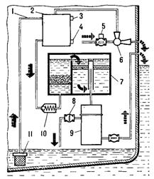 Клапан открывается и эжектор 6, подключенный к системе водоснабжения, начинает отсасывать воздух из вакуумного бака 2. Давление в баке падает, и подсланевая вода поступает в него по трубе 1 через приемную коробку 11. Когда уровень подсланевой воды в баке превышает максимально допустимое значение, измерительный преобразователь 3, размыкая цепь электромагнитного клапана 5, выключает эжектор 6. Давление в баке возрастает и вода из него через обратный клапан 10 поступает в фильтры грубой 7 и тонкой 9 очистки. Очищенная от нефтепродуктов подсланевая вода под давлением выбрасывается из фильтра 9 за борт, а нефтепродукты при открытии крана 8 собираются в специальную цистерну. При опорожнении бака 2 измерительный преобразователь 4 нижнего уровня снова открывает электромагнитный клапан 5. Вступает в действие эжектор, и цикл.подачи подсланевой воды на очистку повторяется до тех пор, пока реле уровня подсланевых вод не перекроет электромагнитный клапан 5. Из устройств подобного назначения, изготовленных зарубежными фирмами, в наибольшей степени требованиям МАРПОЛ 73–78 (Протоколам международных конференций 1973 и 1978 гг. по безопасности танкеров «предотвращению загрязнения моря судами) удовлетворяют установки «Нептуматик» и «Гидропур».