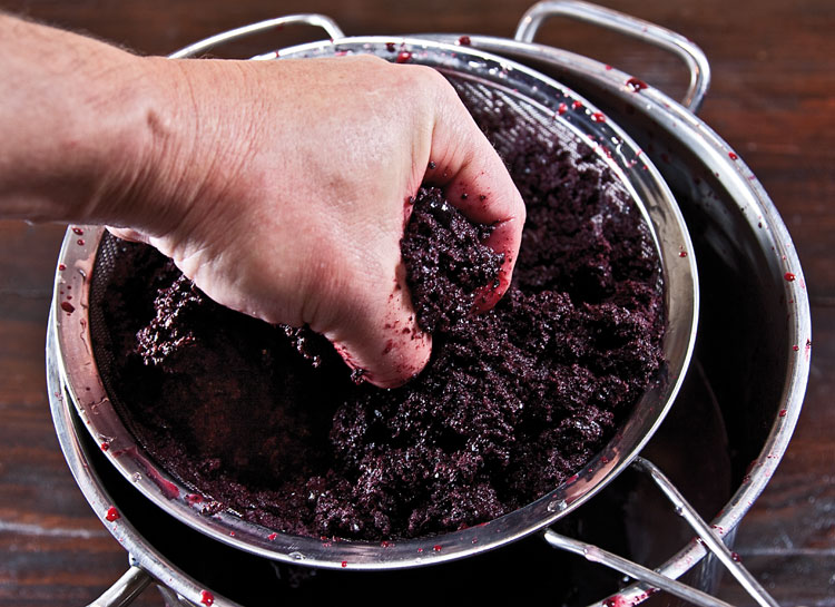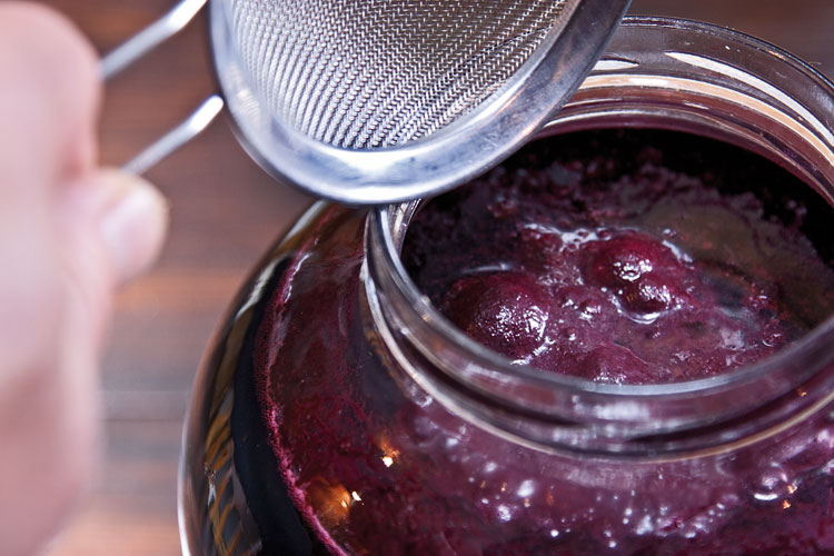 Через неделю-две брожения, не особо сильно отжимая мезгу, даем ей высвободится от новой порции сока. Сок через дуршлаг или ситечко в несколько приемов переливаем в пустую посуду, как и прежде не особо заботясь о том, что сквозь сетку проскочит крупная фракция мезги (будущему вину это не повредит).