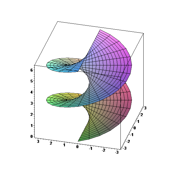 Цель работы: научиться исследовать свойства поверхностей и строить их графические образы на ЭВМ Задание: Исследовать свойства и построить графический образ поверхности: Круговой конус x = u cos(v), y = u sin(v), z = a*u Ход работы: > restart; > assume(a> 0); assume(b> 0); assume(c> 0); assume(u, real); assume(cos(u)> =0); assume(v, real); > #a: =1; b: =2; c: =3; > r: =array(1..3, [u*cos(v), u*sin(v), a*v]);
