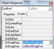 d. Для списков ListBox2 и ListBox1 в обработчиках событий OnDragOver и OnDragDrop выбрать из выпадающих списков уже готовые функции ListBox3DragOver и ListBox3DragDrop: