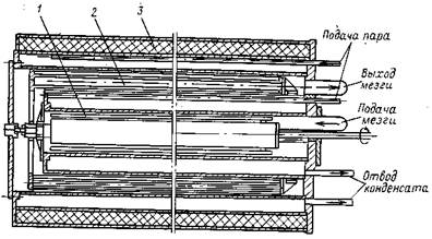 Рис. 6. Схема трубчатого подогревателя мезги: / — внутренняя труба с двухлопастной мешалкой для обработки мезги; 2 — наружное межтрубное пространство с лопастной мешалкой; 3 — корпус с термоизоляцией воздействия 0, 2—0, 4 с обеспечивается такое же повреждение тканей виноградных ягод, как при нагревании до температуры 70 °С. В результате электроплазмолиза содержание полифенолов в сусле увеличивается в среднем на 42 %, азотистых веществ — на 18—22%, железа — на 6, 5—25% в зависимости от режима обработки и сорта винограда; рН повышается на 0, 07—0, 35; незначительно возрастает содержание пектиновых веществ.
