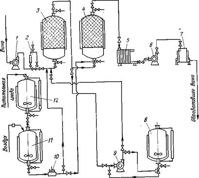 Рис. 36. Схема установки для кислотопонижения вина в потоке поступает в ферментатор 4, а второй (2-5 %) — в культиватор для размножения бактерий 8. Ферментаторы снабжены насадкой с развитой поверхностью, на которой накапливаются и задерживаются клетки бактерий и дрожжей. Вино по насадке стекает тонким слоем, благодаря чему улучшается его контакт с микрофлорой и повышается эффективность процесса кислотопонижения. Температуру вина в ферментаторе 3 поддерживают на уровне 18-20 °С, в ферментаторе 4-6-8 С. В ферментаторе 4 прекращается процесс кислотопонижения и одновременно усиливаются восстановительные функции дрожжей. Из ферментатора 4 виноматериал поступает в пастериза фильтр 7. Культивирование бактерий и дрожжей проводят в соответствии с утвержденной инструкцией. Для нормальной работы установки необходимо, чтобы содержание общей сернистой кислоты было не выше 100—140 мг/л, свободной — 6—14 мг/л. После завершения процесса кислотопонижения виноматериал пастеризуют, фильтруют и сульфитируют с целью инактивации оставшихся в нем микроорганизмов. При нормальных условиях и стабильном режиме работы установки снижение титруемой кислотности обрабатываемого виноматериала достигается в среднем на 2 г/л за 10—12 ч. Для сбраживания яблочной кислоты и кислотопонижения используют также дрожжи рода Shizosaccharomyces — шизоса-харомицеты. Перед внесением чистых культур этих дрожжей в виноградное сусло его пастеризуют. В осветленное сусло вводят раздельно приготовленные разводки дрожжей шизоса-харомицетов и винных дрожжей, каждую в количестве 2 % по объему. При внесении разводок двух дрожжей кислотопо-нижение проходит и заканчивается одновременно со спиртовым брожением. Таким способом можно сбродить часть яблочной кислоты и обеспечить понижение титруемой кислотности на 1, 5—3 г/л, если процесс кислотопонижения проходит в условиях, исключающих развитие других микроорганизмов. В производстве плодово-ягодных вин дрожжи шизосахаро-мицеты приносят большой вред. Они могут за короткий период времени почти полностью разрушить яблочную кислоту, которая является основной в плодово-ягодных винах. Шизосахаро-мицеты обладают высокой устойчивостью к сернистой кислоте, поэтому борьба с ними в условиях плодово-ягодного виноделия затруднена. Химический способ кислотопонижения основан на нейтрализации части кислот и удалении их из продукта в виде нерастворимых солей. При этом виноматериал обрабатывают карбонатом кальция (мелом), не содержащим посторонних примесей. Потребное количество мела вычисляют по формуле Q = 6JnV, где Q — количество мела, г; п — величина снижения кислотности, г/л; V — количество обрабатываемого виноматериала или сусла, дал. Виноматериалы обрабатывают мелом непосредственно после окончания брожения и снятия с дрожжей. После внесения рассчитанного количества мела виноматериалы тщательно перемешивают не менее 1 ч и затем выдерживают при низкой температуре до тех пор, пока содержание кальция в вине не станет ниже 90 мг/л, что указывает на окончание процесса кристаллизации виннокислого кальция. Такой способ обеспечивает удаление только винной кислоты и не изменяет количества яблочной, кальциевая соль которой растворима. Частичное удаление из сусла винной кислоты вместе с яблочной может быть достигнуто при постепенном введении в течени