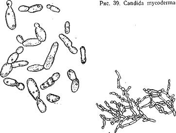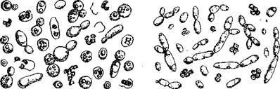 или продолговатую форму (рис. 39) длиной 4, 3—18 мкм и шириной 1, 7—4 мкм. Часто встречаются псевдомицелий и древовидно разветвленные цепочки клеток. Эти дрожжи не образуют спор и не вызывают брожения, развиваются за счет окисления в сусле Сахаров, в вине — спирта, образуют большое количество летучих кислот (до 4 г/л). Продукты обмена их задерживают развитие винных дрожжей и снижают их бродильную способность. Вид Hansenula anomala имеет клетки овальной и цилиндрической формы (рис. 40) длиной 4, 5—20 мкм и шириной 2, 5— 6 мкм с большими вакуолями и жировыми включениями, сильно преломляющими свет. Эти дрожжи образуют споры характерной шляповидной формы, способны вызывать брожение сусла и накапливать до 4—5 % об. спирта. На вине они образуют сухую матовую пленку серовато-белого цвета, всползающую по стенкам. Н. anomala — сильный эфпрообразователь, обогащает вино летучими эфирами, в основном уксусноэтиловым, придающим вину несвойственный ему аромат. Образование летучих кислот при развитии этих дрожжей незначительно. Pichia alcoholophila имеет клетки овальной и эллипсовидной формы (рис. 41) длиной 3, 5—7, 2 мкм и шириной 3, 4— 5 мкм. Иногда встречаются палочковидные и колбасовидные формы длиной до 25 мкм. Образуют споры. Эти дрожжи не вызывают брожения, усваивают сахара только путем окисления, но в основном развиваются за счет окисления спиртов и органических кислот. P. alcoholophila, как и С. mycoderma, вы-