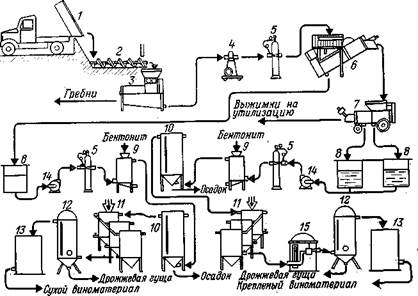 Рис. 47. Технологическая схема производства белых столовых виноматериалов поступают в соответствующие сборники 8. Для получения белых столовых вин используют только сусло-самотек, отбираемый в количестве не более 60 дал из 1 т винограда. Сусло, полученное на шнековых прессах, идет на приготовление ординарных крепленых виноматериалов. Сусло из сборников 8 подают насосами 14 на сульфитацию, а затем обрабатывают в потоке бентонитом (для этого служат дозаторы 9) или другими сорбентами. Если сусло-самотек отстаивают при низкой температуре с предварительным охлаждением, то его сульфитируют пониженными дозами SO2, а бентонитовую суспензию не вводят. При охлаждении сусла до 10— 12 °С время отстаивания уменьшается с 20—24 до 10—12 ч. В случае добавления флокулянтов оно может быть уменьшено д0 4—6 ч. В процессе отстаивания предварительно охлажденного сусла контролируют температуру и содержание в нем взвесей. В момент снятия с осадка в осветленном сусле взвесей должно быть не более 40 г/л, в прессовом сусле — 50 г/л. Осветленное сусло из отстойных резервуаров или из осветлителя непрерывного действия 10 подают в головные резервуары бродильных аппаратов 11. В зависимости от типа аппарата брожение проводят в статических условиях или в потоке на дрожжах чистой культуры. В процессе непрерывного брожения сусла контролируется его подача в головные резервуары бродильных аппаратов и обеспечивается постоянный расход на уровне, установленном для аппарата данного типа, с точностью до ±25 дал/ч. Содержание остаточного сахара на выходе из последнего резервуара бродильного аппарата для сухих столовых виноматериалов составляет 1—3%. Такой виноматериал направляют в емкости для дображивания и осветления 12. При необходимости в них предварительно вводят спирт с помощью дозатора 15. После полного прекращения брожения молодой виноматериал снимают с дрожжей (первая переливка), сульфитируют из расчета 25—30 мг/л и направляют в резервуары 13 для выдержки или хранения. Вторую переливку проводят обычно через 1 —1, 5 мес после снятия с дрожжей также с введением 25—30 мг/л SO2. В процессе хранения емкости систематически доливают не реже одного раза в неделю, чтобы в них не было газовых камер и поверхность вина не соприкасалась с воздухом. Виноматериалы, предназначенные для ординарных сухих столовых вин, подвергают дальнейшим обработкам с целью придания им розливостойкости. Технологическую схему обработки виноматериалов выбирают в зависимости от их особенностей и физико-химического состояния. Осветление проводят в течение 8—20 сут в зависимости от характера помутнений и способа обработки. Обработанные вина подвергают отдыху не менее 10 сут в условиях, исключающих доступ к ним воздуха, фильтруют на фильтрах, обеспечивающих полную прозрачность вина с блеском, и разливают в бутылки для реализации. Для предупреждения окисления белых столовых вин содержание свободной сернистой кислоты в них перед подачей на розлив доводят до 20 мг/л. С этой же целью из вина перед розливом удаляют растворенный кислород путем смешивания вина в потоке с инертными газами (смесью азота и диоксида углерода) на специальной установке, вмонтированной в линию подачи вина на розлив. Газы поступают в вино в диспергированном состоянии в виде мелких пузырьков через специальную насадку-распылитель. Кисло