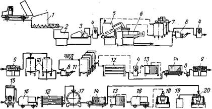 Рис. 49. Технологическая схема производства столовых полусладких и полусухих вин: / — бункер-питатель; 2 — валковая дробилка; 3 — мезгонасос; 4 — сульфодозатор; 5 — стекатель; 6 — пресс; 7 — резервуары для настаивания на мезге; 8 — насос; 9 — дозатор ингредиентов; 10 — установка для осветления сусла; // — бродильный аппарат; 12 — ультраохладитель; 13 — пастеризатор; 14 — фильтр; 15 — осветлитель вина в потоке; 16 — диатомитовый фильтр; П — емкость для выдержки на холоде; IS — установка для горячего розлива; 19 — баллон с С02; 20 — установка для стерильного розлива пажи могут вводиться также недоброды и вакуум-сусло. Купажирование проводят не менее чем за 40—45 сут до розлива. За этот срок осуществляют полную технологическую обработку, которая должна обеспечивать стабильность вина после розлива в бутылки в течение не менее 3 мес. Обработанные розливостойкие вина хранят до розлива при низкой температуре, исключающей подбраживание, в герметичных емкостях, лучше в атмосфере С02. Рекомендуется дополнительная выдержка при температуре 40 °С в течение 15— 20 сут при отсутствии доступа воздуха. Такая выдержка ускоряет созревание и улучшает качество вина. Современная технологическая схема производства столовых полусухих и полусладких вин приведена на рис. 49. Готовые полусухие и полусладкие столовые вина разливают в бутылки различными способами, которые исключают инфицирование вина и доступ к нему воздуха: на линиях горячего или стерильного розлива, с применением бутылочной пастеризации, с введением сорбиновой и сернистой кислот. Для обеспечения стабильности готовых столовых вин, содержащих сахар, преимущественно применяют бутылочную пастеризацию или горячий розлив. Розлив вина при температуре 55—60 °С в подогретые до 50 °С бутылки обеспечивает достаточную стабильность продукта и более удобен в производстве, чем бутылочная пастеризация. Известен также холодный стерильный розлив, который гарантирует надежную ста- бильность вин только при полном исключении инфекции извне, что трудно обеспечить в производственных условиях. Пробки для укупорки бутылок предварительно стерилизуют 1 %-ным раствором сернистой кислоты, нагреванием или другими способами. После розлива, в бутылки столовые полусухие и полусладкие вина хранят при температуре от —2 до 8°С. Все полусухие и полусладкие столовые вина относятся к категории ординарных, так как они не подлежат выдержке. Винодельческая промышленность СССР выпускает ряд высококачественных белых и красных полусладких столовых вин. Эти вина отличаются оригинальным нежным и гармоничным вкусом, имеют ярко выраженный характерный аромат. Для каждого из этих вин используют определенные сорта винограда, культивируемого в соответствующих местных условиях. Исторически сложившаяся технология этих вин основана на проведении повторных сульфитации и фильтраций во время медленного брожения сусла с целью угнетения и удаления дрожжей. В результате этих приемов задерживается брожение и в недоброде устанавливаются нужные кондиции по сахару и спирту. Вина Грузинской ССР. По первой схеме здесь готовят белые вина, которые содержат 10—12 % об. спирта и 3—5 % сахара. Наиболее известны из них Атенури, Ах мет а, Псоу, Твиши из Цоликоули, Тетра из Рачули тетры. Красные вина содержат спирта от 10, 5 до 13% об. и сахара 3—6%. К лучшим полусладк