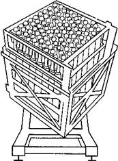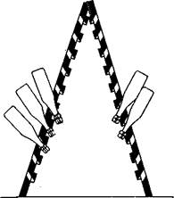 Рис. 57. Пюпитр для ремюажа лышко бутылки на внутреннюю поверхность пробки. Этот сложный процесс, называемый ремюажем, выполняют высококвалифицированные мастера (ремюоры) вручную на станках — пюпитрах или с помощью специальных машин. Пюпитры (рис. 57) представляют собой две створки-плоскости из досок, скрепленных вверху шарнирами, а внизу цепочкой, которая позволяет раздвинуть створки на расстояние 100—120 см. Каждая створка имеет 10 горизонтальных и 6 вертикальных рядов отверстий, в которые наклонно устанавливают бутылки. Отверстия в пюпитрах имеют сложную форму, обеспечивающую возможность изменять положение бутылок от почти горизонтального до близкого к вертикальному. Перед загрузкой бутылок в пюпитры контролируют состояние вина, определяют содержание в нем несброженных Сахаров, измеряют давление. Содержимое бутылок взбалтывают и бутылки вкладывают горлышками в отверстия пюпитров в положении, близком к горизонтальному. Затем их оставляют в покое на 10 сут, чтобы дать осадку осесть на внутренней поверхности бутылок. На нижнюю часть донышка каждой бутылки наносят четкую полосу, позволяющую ремюору ориентироваться при поворотах бутылок. В процессе ремюажа плечики бутылок ежедневно подвергают легким ударам о края отверстий пюпитра, бутылки поворачивают вокруг их продольной оси на '/е. 1U или 7г окружности донышка и уменьшают угол, образуемый бутылкой и пюпитром. В начале работы повороты бутылок делают на '/в окружности, к концу их увеличивают. Сотрясения бутылок во