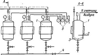 С02 Воздух J А Дрожжевая разводка Рис. 61. Аппаратурно-технологическая схема культивирования дрожжей гра-диентно-непрерывным способом: J—дрожжевой аппарат; 2 — мешалка; 3 — барботер; 4 — дрожжепровод; 5 — счетчик расхода воздуха N