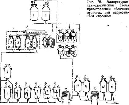 Общий технологический цикл составляет 52—84 дня. Игристые вина можно готовить по разработанной акад. А. С. Вечером и сотрудниками аппаратурно-технологической схеме приготовления яблочных игристых вин — игристого сидра и яблочного игристого — в непрерывном потоке (рис. 70). При получении игристого сидра в сухой виноматериал, приготовленный сбраживанием натурального яблочного сока, вводят тиражный ликер из резервуара 5 (из расчета содержания сахара в тиражной смеси 3, %) и (NH4)3P04 или (NH4)2HP04 (20 г на 100 л). Приготовленную в резервуарах / тиражную смесь после фильтрации пастеризуют при температуре 80—85 °С в течение 2 мин в. теплообменнике 2 и направляют в подготовительный аппарат 3. Затем из дрожжанок 4 в аппарат подают разводку чистой культуры винных дрожжей в количестве 8—10 % объема тиражной смеси и проводят подбраживание в периодическом цикле. Затем половину бродящей смеси, находящейся в подготовительном аппарате, направляют с охлаждением в потоке до 12—14 °С поочередно в резервуары 7 и 8 бродильной батареи. Они являются резервуарами-питателями и включаются в работу попеременно при постоянном давлении в них 50—60 кПа. Оставшуюся в подготовительном аппарате бродящую смесь пополняют новой порцией тиражной смеси (без дрожжей). Такой цикл работы обеспечивает полное воспроизводство дрожжей, их адаптацию и эффективное последующее брожение под давлением.
