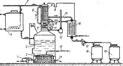 Рис. 74. Аппарат однократной сгонки: / — конденсационный горшок; 2 — змеевик греющего пара; 3 — перегонный куб; 4 — куб-преднагреватель; 5 — укрепляющая колонка; б — трубопровод для отвода водно-спиртовых паров в дефлегматор; 7 — трубопровод для отвода охлаждающей воды из дефлегматора; 8 — дефлегматор; 9 — дистанционные термометры; 10 — трубопровод для отвода флегмы в колонну; II — ротаметр; 12 — вакуум-прерыватель; 7.3 —трубопровод подвода греющего пара; 14 — трубопровод для отвода барды; 15 — трубопровод для отвода водно-спиртовых паров в холодильник-конденсатор; 16 — холодильник-конденсатор; П — спиртовой фонарь; 18, 19 — приемники дистиллята крепость в среднем 25—30 % об.). Эта фракция носит название «душистые воды». Душистые воды обладают приятным ароматом и после выдержки в дубовых бочках используются иногда' в купажах ординарных коньяков. Для увеличения выхода коньячного спирта на практике используют также перегонку смеси головной и хвостовой фракций. Получаемые от такой перегонки головную и хвостовую фракции направляют на ректификацию. Разрешается к смеси головной и хвостовой фракций добавлять перед ее фракционной перегонкой 3—4 % дрожжей и 8—10 % коньячных винома-териалов. Коньячные спирты, получаемые по указанной схеме, используют для производства ординарных коньяков. Добавка головной и особенно хвостовой фракций к перегоняемому виноматериалу или спирту-сырцу позволяет увеличить выход в пересчете на безводный спирт коньячного спирта до 90, 5—92, 5%. Улучшаются также удельные эксплуатационные показатели, связанные с расходом пара и воды на 1 дал в пересчете на безводный коньячный спирт. Полученная после перегонки виноматериала жидкость (барда) утилизируется с целью извлечения из нее виннокислых соединений. Отработавшая после перегонки спирта-сырца жидкость утилизации не подлежит. Количество спирта в барде и отработавшей жидкости не должно превышать 0, 1 % об. Установка однократной сгонки обеспечивает получение коньячного, а также плодовых спиртов непосредственно из виноматериалов, минуя стадию приготовления спирта-сырца. На отечественных заводах наибольшее распространение получили аппараты однократной сгонки с укрепляющими колонками (рис. 74). Укрепление спиртовых паров до кондиций головной, средней (коньячный спирт) и хвостовой фракций достигается с помощью укрепляющей колонки 5. Процесс укрепления спиртовых паров происходит при их непрерывном контакте со стекающим по тарелкам колонки из дефлегматора 8 дистиллятом (флегмой). Пар, контактируя с флегмой на тарелке, конденсируется. За счет теплоты его конденсации выделяется вторичный пар с большим содержанием нижекипящего компонента (этилового спирта), чем пар, поступающий с нижележащей тарелки. Аналогичные процессы массообмена происходят на всех тарелках. Их количество можно определить графическим путем по диаграмме зависимости крепости жидкой и паровой фаз (см. рис. 71). Поскольку дефлегматор равноценен одной теоретической тарелке (т. т.), для достижения требуемых кондиций спирта во фракциях дополнительно необходимо в укрепляющей колонке иметь 1, 5—2 т. т.* Образующиеся в дефлегматоре спиртовые пары поступают в холодильник-конденсатор 16, где конденсируются и охлаждаются до температуры 17°С. Дистиллят через спиртовой фонарь поступает в сборники. При перегонке загрузк