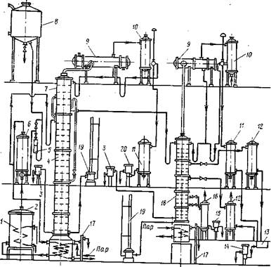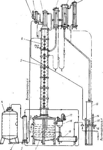 Рис. 77. Схема аппарата непрерывного действия с раздельным отбором фракций коньячного спирта различной спиртуозности: / — змеевик греющего пара; 2 —перегреватель; 3 — пробный холодильник; 4 — отгонная колонна; 5 — ротаметр; 6 — охладитель перегретого вина; 7 — эпюрационная колонна; 8 — напорный бак для вина; 9 — дефлегматор; 10 — конденсатор; 11 — холодильник; /2 — конденсатор-холодильник; 13 — смеситель; 14, 15, 20 — спиртовые фонари соответственно средней, хвостовой и головной фракций; 16 — конденсатор-холодильник хвостовой фракции; П — бардорегулятор; 18 — колонна дистилляции эпюрата; 19 — вакуум-прерыватель ванного вина осуществляется так же, как на установке К-5. Часовой расход виноматериала, поступающего в аппарат, составляет 160—180 дал. Спиртовые пары, укрепляясь в дефлегматорах 10, 11 до кондиций коньячного спирта, после конденсации и охлаждения отбираются через спиртовой фонарь 16 в сборник дистиллята. Температура выходящей воды в первом дефлегматоре поддерживается на уровне 80—90 °С, во втором — 50—65 °С. Вытекающая из куба 1 барда направляется на утилизацию. Дистилляционные коньячные установки с получением и последующей дистилляцией промежуточных крепких спиртопродуктов более сложны по конструкции и выполняются, как правило, в двух- или трехколонном варианте. Они более перспективны для воспроизвеле- ния в потоке классического (шарантского) способа перегонки виноматериалов на коньячный спирт, так как позволяют достичь максимального выделения в дистиллят летучих веществ вне зависимости от крепости виноматериала на тарелке питания и обеспечить фракционирование неочищенного дистиллята от примесей головного характера. В установке (рис. 77), разработанной МТИППом, винома-териал подвергается дистилляции в колонне 4 с последующей эпюрацией водно-спиртовых паров в эпюрационной колонне 7 и окончательной дистилляцией эпюрата в специальной колонне 18. Виноматериал перед поступлением в отгонную колонну, состоящую из выварной и истощающей частей, проходит последовательно охладитель перегретого вина, куб колонны и перегреватель. В охладителе встречаются два потока виноматериала: перегретый из перегревателя и холодный из напорного бака. Отдав часть тепла холодному виноматериалу, виноматериал из перегревателя при температуре 80—85 °С поступает в выварную часть дистилляционной колонны. В этой части колонны из виноматериала удаляется основная (до 90 %) часть этилового спирта и летучих примесей в виде водно-спиртовых паров. Эти пары поступают в эпюрационную колонну, которая обогревается водно-спиртовыми парами из истощающей части отгонной колонны. В результате контакта конденсата спиртовых паров из дефлегматора 9 с парами из истощающей части отгонной колонны происходит образование спиртовых паров, которые в количестве 1—3 % (в пересчете на безводный спирт) отбираются из холодильника //. Эта фракция (головная) имеет крепость 75—80 % об. Эпюрат, обогащенный высококипящими примесями, направляется из выварной части эпюрационной колонны в колонну дистилляции эпюрата, где производится отбор основного (через дефлегматор 9, конденсатор 10, холодильник 11) и промежуточных (через конденсаторы-холодильники 12) продуктов различной спиртуозности. Смешивание спиртовых продуктов, отобранных из различных точек колонны дистилляции эпюрата, способствует 