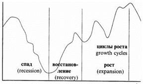 - рецессия (Recession) или спад - снижение деловой активности, падение производства, уровня занятости и доходов (по степени падения различают кризис и депрессию); - восстановление (Recovery) - это подъем экономической активности, рост рыночной конъюнктуры, возрастание выпуска после его падения, имевшего место в период рецессии, до прежних уровней; - развитие (Expansion) - продолжение роста экономики после стадии восстановления, как правило, до достижения нового максимума выпуска, превосходящего достигнутый в предыдущем цикле; стадия развития иногда может включать несколько циклов, которые в этом случае именуются циклами роста (Growth cycles). В зависимости от природы индикаторов и их связи с общей экономической динамикой, принято выделять: - проциклические индикаторы (ход которых совпадает с общим направлением экономического роста - прибыли корпораций растут на подъеме экономики); - противоциклические (которые направлены против общего роста - безработица растет когда экономика падает); - ациклические (поведение которых мало меняется внутри цикла).