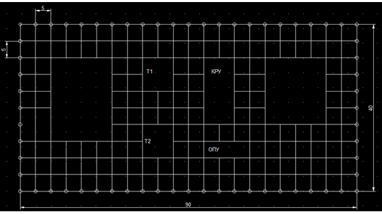 Подстанция является понижающей, расположенная в III климатической зоне, имеет два автотрансформатора напряжением 110/35/10, кВ, для питания собственных нужд имеется два трансформатора 10/0, 4; Распределительные устройства 110 и 35 кВ открытого типа, 10 кВ закрытого. Ожидаемый ток короткого замыкания на низкой стороне 10 кВ Площадь подстанции Красноармейская 110/35/10 кВ Грунт двухслойный: удельное сопротивление верхнего слоя (песок) По периметру контура в грунт забиты вертикальные элементы (стержни) диаметром d = 0, 04 м и длиной Ɩ = 10 м, соединенные стальной полосой сечением 40х4 мм, горизонтальная сетка внутри контура состоит из полос сечением 4х40 мм. Толщина верхнего слоя земли Глубина погружения электрода в землю – расстояние от поверхности земли до электрода Составляем предварительную схему заземлителя, по которой определяем площадь территории, занимаемой заземлителем, S, Сетка заземления не должна пролегать непосредственно под оборудованием, поэтому, рассчитав количество электродов, необходимо сгустить линии сетки там, где нет оборудования, и, наоборот, разредить там, где находится оборудование.