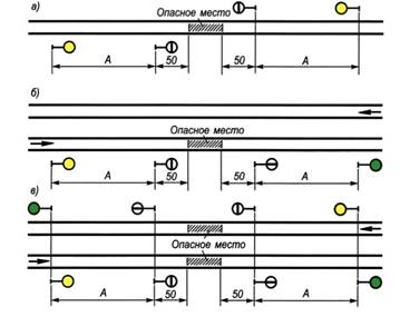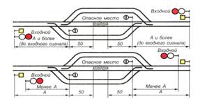 Рис. 3.1 Места, требующие постоянного уменьшения скорости, ограждаются с обеих сторон на расстоянии 50 м, а на железнодорожных путях необщего пользования – 15 м, от границ опасного места постоянными сигнальными знаками «Начало опасного места» и «Конец опасного места». От этих сигнальных знаков на расстоянии А, указанном в графе 3 табл. 3.11, в зависимости от руководящего спуска и максимальной допускаемой скорости движения поездов на перегоне устанавливаются постоянные сигналы уменьшения скорости, а на железнодорожных путях необщего пользования на расстоянии величины тормозного пути, определяемой и устанавливаемой владельцем железнодорожных путей необщего пользования (далее – расстояние «Т») - сигналы уменьшения скорости. В табл. 3.1 и на всех схемах, помещенных в настоящей Инструкции, расстояния даны в метрах Таблица 3.1