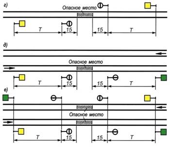 Схемы установки постоянных дисков уменьшения скорости и сигнальных знаков «Начало опасного места» и «Конец опасного места» владельца инфраструктуры на однопутном участке приведены на рис. 3.2 а, на одном из путей двухпутного участка — на рис. 3.2 б, на обоих путях двухпутного участка — на рис. 3.2 в, а на железнодорожных путях необщего пользования сигналов уменьшения скорости и сигнальных знаков «Начало опасного места» и «Конец опасного места» – соответственно на рис. 3.2 г, 3.2 д, 3.2 е. Перечень перегонов с указанием расстояния, на котором должны соответственно укладываться петарды и устанавливаться сигналы уменьшения скорости в зависимости от руководящего спуска и максимальной допускаемой скорости движения поездов на перегоне, а на железнодорожных путях необщего пользования – в зависимости от расстояния «Т», устанавливаются соответственно владельцем инфраструктуры, владельцем железнодорожных путей необщего пользования.