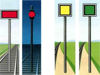 Рис. 3.2 3.2 К переносным сигналам относятся: щиты прямоугольной формы красного цвета с обеих сторон или с одной стороны красного, а с другой — белого цвета; квадратные щиты желтого цвета (обратная сторона зеленого цвета); фонари на шестах с красным огнем и красные флаги на шестах. 3.3. Переносными сигналами предъявляются требования: прямоугольный щит красного цвета (или красный флаг на шесте) днем и красный огонь фонаря на шесте ночью — «Стой! Запрещается проезжать сигнал» (рис. 3.3 а); квадратный щит желтого цвета днем и ночью (рис. 3.3 б) при расположении опасного места: на перегоне — «Разрешается движение с уменьшением скорости, впереди опасное место, требующее остановки или проследования с уменьшенной скоростью»; на главном пути станции — «Разрешается движение с уменьшением скорости, впереди опасное место, требующее проследования с уменьшенной скоростью»; на остальных станционных путях — «Разрешается проследование сигнала со скоростью, указанной в предупреждении, а при отсутствии его — со скоростью не более 25 км/ч, а на железнодорожных путях необщего пользования – со скоростью не более 15 км/ч». Обратная сторона квадратного щита (зеленого цвета) днем и ночью (рис. 3.3 в) на перегоне и на главном пути станции указывает на то, что машинист имеет право повысить скорость до установленной после проследования опасного места всем составом.