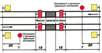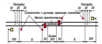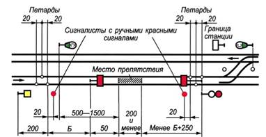 рис. 3.6 Петарды должны охраняться работниками подразделений инфраструктуры или железнодорожных путей необщего пользования, которые обязаны стоять с ручными красными сигналами на расстоянии 20 м от первой петарды в сторону места препятствия. Сигналы устанавливаются в первую очередь со стороны ожидаемого поезда. На однопутных участках, если неизвестно, с какой стороны ожидается поезд, сигналы устанавливаются в первую очередь со стороны спуска к ограждаемому месту, а на площадке — со стороны кривой или выемки. Детальный порядок действий работников при ограждении внезапно возникших препятствий определяется соответствующей инструкцией, утвержденной владельцем инфраструктуры, владельцем железнодорожных путей необщего пользования. 3.6. Места, через которые поезда могут проходить только с проводником (со скоростью менее 15 км/ч), а также сплетения путей на двухпутных участках в одном уровне ограждаются как место препятствия для движения, но без укладки петард. Об установке этих сигналов на поезда выдаются письменные предупреждения. При необходимости пропустить с проводником поезд, на который не выдано предупреждение, укладка петард обязательна. Если пропуск поездов с проводником устанавливается на продолжительное время, то переносные красные сигналы допускается заменять светофорами прикрытия, оставляемыми в закрытом положении, с установкой впереди них предупредительных светофоров (рис. 3.7).