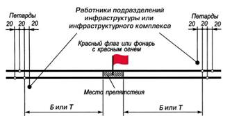 Рис. 3.5 д При подходе поезда к переносному желтому сигналу машинист обязан подать один длинный свисток локомотива, мотор-вагонного подвижного состава, специального самоходного подвижного состава, а при подходе к сигналисту с ручным красным сигналом подать сигнал остановки и принять меры к немедленной остановке поезда, чтобы остановиться, не проезжая переносного красного сигнала. Сигналисты для отличия от других работников железнодорожного транспорта должны носить головной убор с верхом желтого цвета и сигнальный жилет. Места препятствий для движения поездов и места производства работ на многопутных перегонах ограждаются в соответствии с порядком, установленным владельцем инфраструктуры, владельцем железнодорожных путей необщего пользования. 3.5. При внезапном возникновении препятствия и отсутствии необходимых переносных сигналов следует немедленно на месте препятствия установить сигнал остановки (рис. 3.6): днем — красный флаг, ночью — фонарь с красным огнем и с обеих сторон на расстоянии Б, указанном в графе 4 табл. 3.1, в зависимости от руководящего спуска и максимальной допускаемой скорости движения поездов на перегоне уложить по три петарды, а на железнодорожных путях необщего пользования установить сигнал остановки со стороны ожидаемого поезда на расстоянии «Т».