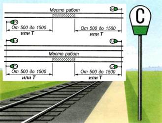 рис. 3.9 Переносные сигналы уменьшения скорости и сигнальные знаки «Начало опасного места» и «Конец опасного места» на станционных путях и многопутных перегонах могут применяться с укороченными шестами. 3.9. Места производства работ на пути, не требующие ограждения сигналами остановки или уменьшения скорости, но требующие предупреждения работающих о приближении поезда, ограждаются переносными сигнальными знаками «С» — подача свистка, которые устанавливаются у пути, где производятся работы, а также у каждого смежного главного пути. Расстановка сигналов показана на рис. 3.10, где для железнодорожных путей необщего пользования расстояние от места работ до сигнального знака «С» равно расстоянию «Т». Переносные сигнальные знаки «С» устанавливаются таким же порядком у смежных главных путей и при производстве работ, огражденных сигналами остановки (см. рис. 3.4 б и 3.5) или сигналами уменьшения скорости. На перегонах, где обращаются поезда со скоростью более 120 км/ч, переносные сигнальные знаки «С» устанавливаются на расстоянии 800–1500 м от границ участка работ.