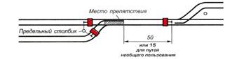 рис. 3.11 При ограждении переносными красными сигналами места препятствия или производства работ на стрелочном переводе сигналы устанавливаются: со стороны крестовины — против предельного столбика на оси каждого из сходящихся путей; с противоположной стороны — в 50 м, а на железнодорожных путях необщего пользования — 15 м от остряка стрелки (рис. 3.12 а).