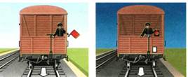 рис. 7.2 а При движении вагонами вперед по неправильному пути голова грузового поезда обозначается: днем — развернутым красным флагом, показываемым с левой стороны сопровождающим поезд работником, находящимся на передней переходной площадке; ночью — прозрачно-белым огнем фонаря у буферного бруса и красным огнем ручного фонаря, показываемым с левой стороны сопровождающим поезд работником (рис. 7.2 б).