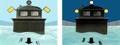 рис. 7.9 а Последняя убираемая часть поезда обозначается так же, как хвост грузового поезда. 7.7 Поезда на многопутных участках обозначаются так же, как на однопутных и двухпутных в зависимости от установленного порядка движения по одному или другому пути многопутного участка. 7.8 Снегоочиститель при движении на однопутных и по правильному пути на двухпутных участках обозначается: если в голове снегоочиститель: днем - два желтых развернутых флага на боковых крюках; ночью - два желтых огня боковых фонарей, а в сторону локомотива - два прозрачно-белых контрольных огня (рис. 7.9 б);