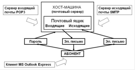 Данный сервис обеспечивает взаимодействие с удаленным компьютером. Он позволяет превратить компьютер пользователя в удаленный терминал другого компьютера. Поэтому данный сервис еще называют э муляцией удаленного терминала. Терминал от обычного компьютера отличается тем, что не выполняет собственные вычисления. Все, что вводится на клавиатуре рабочей станции, передается удаленному компьютеру, а получаемые результаты передаются обратно и выводятся на монитор рабочей станции. В качестве удаленных компьютеров, в основном, используются машины, работающие под управлением операционной системы UNIX [Юникс]. Поэтому для работы в режиме удаленного терминала требуется знание основных команд данной операционной системы. С развитием графических операционных систем, таких, как Windows, командный режим работы стал менее популярен, и сервис Telnet в последнее время большинство пользователей не применяют. Многие информационные системы, ранее доступные исключительно с помощью Telnet, сегодня доступны из Всемирной паутины, о которой речь пойдет ниже. Установив связь с помощью Telnet, пользователь получает возможность работать с удаленным компьютером, как со " своим", т.е. теоретически получить в свое распоряжение все ресурсы, если к ним разрешен доступ. Реально Telnet предоставляет открытый доступ, но организация взаимодействия полностью определяется удаленным компьютером. Два вида услуг Internet требуют подключения к серверам через Telnet: библиотечные каталоги и электронные доски объявлений (BBS). Работа с удаленной системой может вестись в " прозрачном" режиме, когда программы на сервере и у клиента только обеспечивают протокол соединения, и в командном, когда клиент получает в свое распоряжение набор команд сервера. Следует заметить, что из соображений безопасности намечается тенденция сокращения числа узлов Internet, позволяющих использовать Telnet для подключения к ним. . Отложенное общение в Интернете - интернет электронная почта пользователь Электронная почта - E-mail - это наиболее старая и одна из самых массовых служб Сети. Ее назначение - поддержка обмена электронными письмами между пользователями. По своей сущности электронная почта - это система обмена электронными сообщениями в компьютерных сетях (в режиме отложенного общения -offline). Схема работы электронной почты отражена на рисунке. Почтовый сервер - это своеобразное почтовое отделение, куда поступает входящая и исходящая корреспонденция зарегистрированных на нем пользователей. Эта корреспонденция помещается в «почтовые ящики» пользователей - специально отведенные разделы на жестком диске. Каждый пользователь получает персональный почтовый адрес, по которому к нему будут поступать письма. Следует отметить, что адреса электронной почты несколько отличаются от других адресов Интернета, но очень похожи. Они состоят из двух частей, разделенных символом @. Справа от символа располагается Интернет-адрес компьютера, на котором располагается почтовое отделение абонента. Этот адрес формируется так же, как и любое другое доменное имя в Интернете. Слева от символа @ расположено имя абонента.