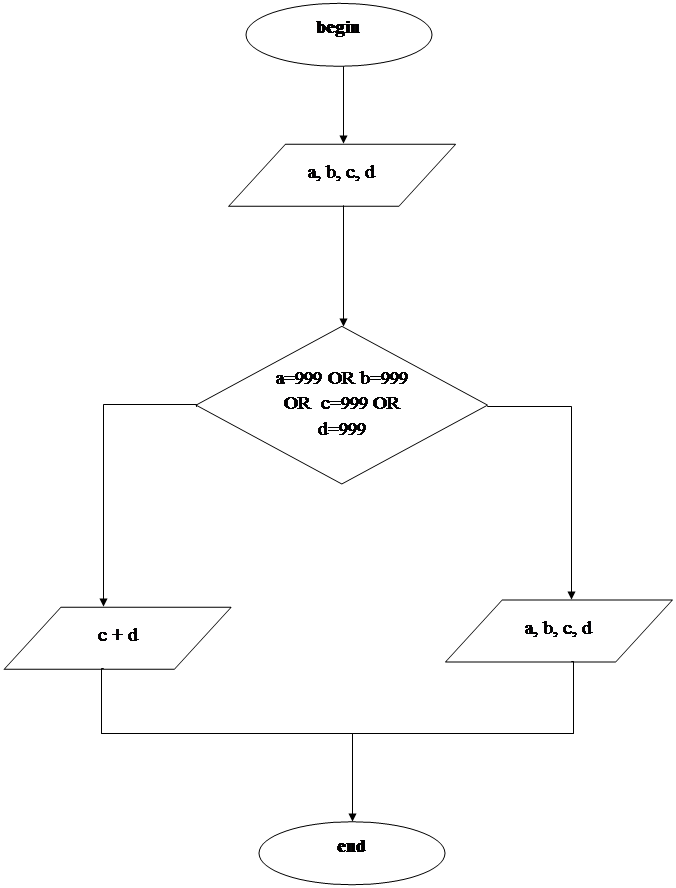 ТЕМА1. ИСПОЛЬЗОВАНИЕ ЛОГИЧЕСКИХ ОПЕРАТОРОВ 7. Дано четыре числа. Если среди них найдется число 999, то напечатать все четыре числа, в противном случае –сумму двух последних Этап 1.Физическая постановка задачи Дано: · А, B, C, D – вещественные числа. · Если среди них найдется число 999, то напечатать все четыре числа, в противном случае –сумму двух последних Этап 2.Математическое описание · A, B, C, D – числа к которым будет применено условие · В данной программе будет применено следующее логическое выражение А ОR B OR C OR D, в случае выполнения которого на печать будут выведены числа A, B, C, D. В противном случае будет выведена сумма двух последних чисел (C, D) Этап 3.Описание алгоритма решения задачи