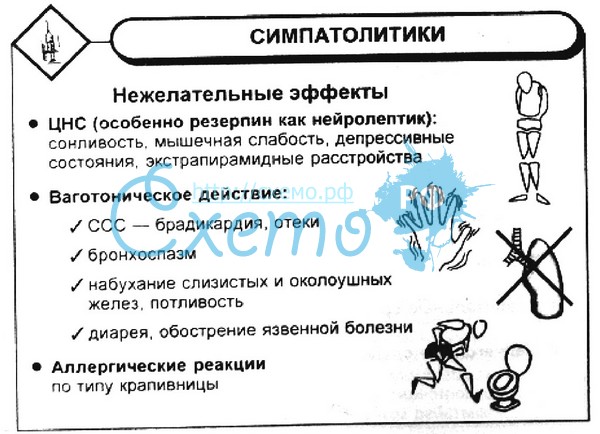 Симпатолитики (sympatholytica; анат. sympathica симпатическая часть вегетативной нервной системы + греч. lyticos растворяющий, ослабляющий) — группа лекарственныx средств, оказывающих тормозящее влияние на передачунервного импульса симпатической нервной системой к эффекторным органам. Воздействуют как на уровне периферических органов (сердце, сосуды), так и на уровне ЦНС, с чем связано разнообразие клинических и побочных эффектов данной группы препаратов. Наиболее известные представители —резерпин и гуанетидин (октадин), применяемые в медицине для лечения артериальной гипертензии. Механизм действия Под воздействием симпатолитиков происходит ускоренный выход катехоламинов из гранулярных депо пресинаптических нервных окончаний симпатической нервной системы, вследствие чего снижается количествонейромедиаторов на уровне окончаний постганглионарных адренергических волокон. Высвобожденные катехоламиныподвергаются дальнейшему разрушению моноаминооксидазой (МАО). Показания к применению Уменьшение симпатических влияний на внутренние органы и кровеносные сосуды и активизация парасимпатических приводят к следующим клиническим эффектам: · расширение сосудов · снижение артериального давления · уменьшение частоты сердечных сокращений · в больших дозах возможно нейролептическое действие · усиление перистальтики кишечника · повышение секреции экзокриных желез