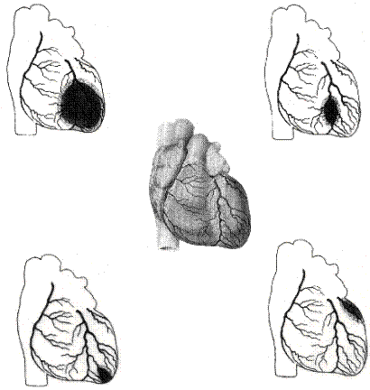 Рис. Дестабілізація (тромбоз) коронарного кровоплину в різних басейнах правої та лівої коронарної артерії.