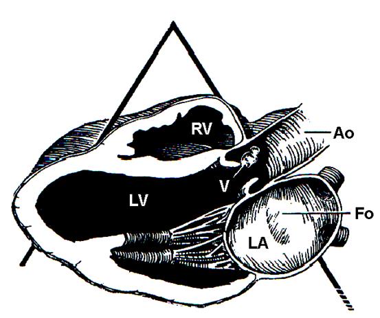 (адаптовано за Г.В.Кнышовым, Я.А.Бендетом, 1997); Ао - аорта; Fo - foramen ovale; LA - ліве передсердя; LV - лівий шлуночок; RV - правий шлуночок; V - вегетації на аортальному клапані.