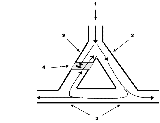 Рис. 22. Cхема механізма re-entry - циркуляції імпульса по волокнах Пуркін'є. 1- жмуток Гіса, 2 - гілка волокна Пуркіньє, 3 – кардіоміоцит, 4 - ділянка сповільненого проведення імпульса в антероградному напрямку і вільного проведення в ретроградному напрямку.