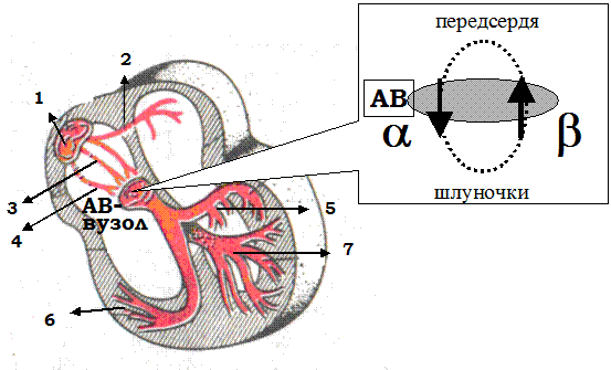 Рис. 25. Re-entry дисоціація АВ-вузла на зону a і β з різною рефрактерністю. Проведення: антеградно - через α -зону (“slow-fast”-тахікардія), ретроградно - через β -зону (”fast- slow”-тахікардія). 1 - синусовий вузол, 2 - жмуток Бахмана, 3 - жмуток Венкебаха, 4 - жмуток Торреля, 5 - передньо-верхня гілка жмутка Гіса, 6 - передньо-нижня гілка жмутка Гіса, 7 - задня гілка жмутка Гіса.
