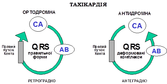 Рис. 26. Cхема виникнення АВ-вузлової реципрокної пароксизмальної тахікардії. Реципрокні атріовентрикулярні тахікардії за участю додаткових шляхів проведення. Синдром передчасного збудження шлуночків (синдром преекситації) є причиною пароксизмів суправентрикулярної тахікардії, мерехтіння передсердь, які можуть призводити до летального кінця в результаті спровокованої через фібриляцію передсердь шлуночкової тахікардії. Є багато додаткових шляхів проведення, з них основними є: додатковий атріовентрикулярний шлях (жмуток Кента) – між передсердями і шлуночком; інтернодальний (волокна Джеймса) – між передсердями і атріовентрикулярним вузлом; атріовентрикулярний шлях – між передсердям та пучком Гіса; нодовентрикулярний шлях (волокна Махейма-1) – між атріовентрикулярним вузлом і шлуночком; фасцикуло-вентрикулярний шлях (волокна Махейма-2) – між пучком Гіса та шлуночком. Електрофізіологічним механізмом аритмій при синдромі преекситації є коловий рух хвилі збудження в міокарді та волокнах провідної системи серця із залученням аномальних шляхів проведення до тих пір, поки не наступить функціональна блокада одного з двох трактів.